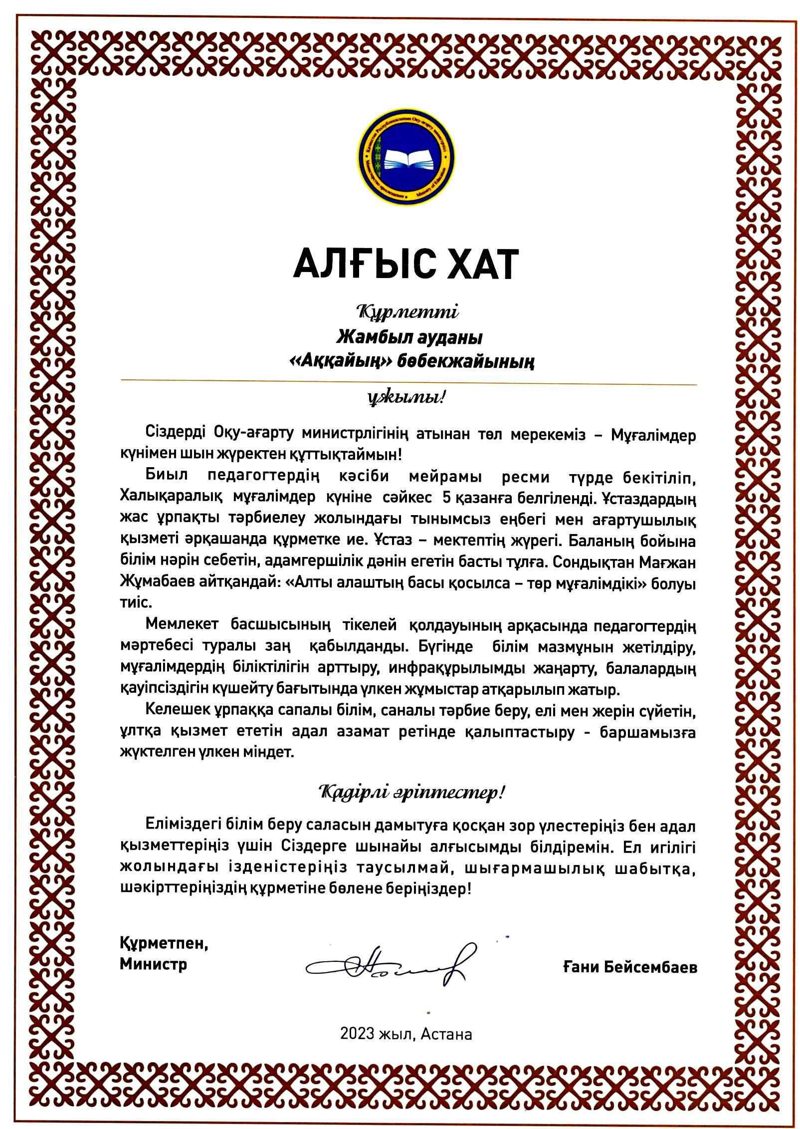 "Аққайың" бөбекжайы » Ақпарат » Ұстаздар күнінде бала бағбандарына берілген үлкен марапат болды. Оқу-ағарту министрі Ғани Бейсембаевқа "Аққайың" бөбекжай ұжымы үлкен алғыс білдіреді...
