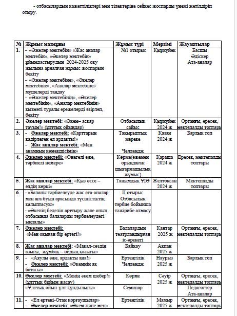 09 сентябрь 2024 0 1 2 3 4 5 КМҚК «Аққайың» бөбекжайында «Әжелер мектебін» «Жас аналар мектебін», «Әкелер мектебін» ұйымдастырудың 2024-2025 оқу жылына арналған жұмыс жоспары
