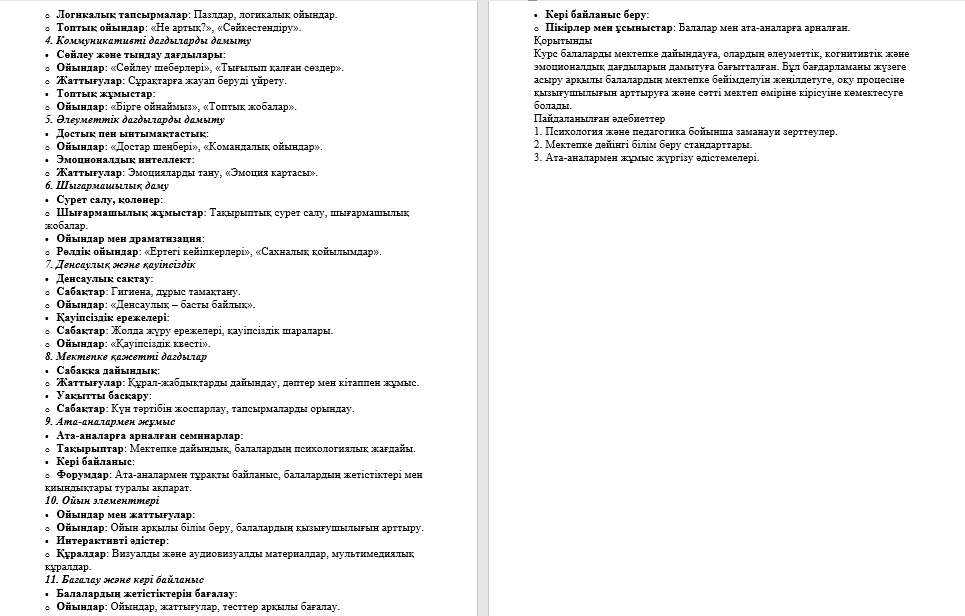 «Болашақ бірінші сынып оқушысының мектебі» курсының мазмұны